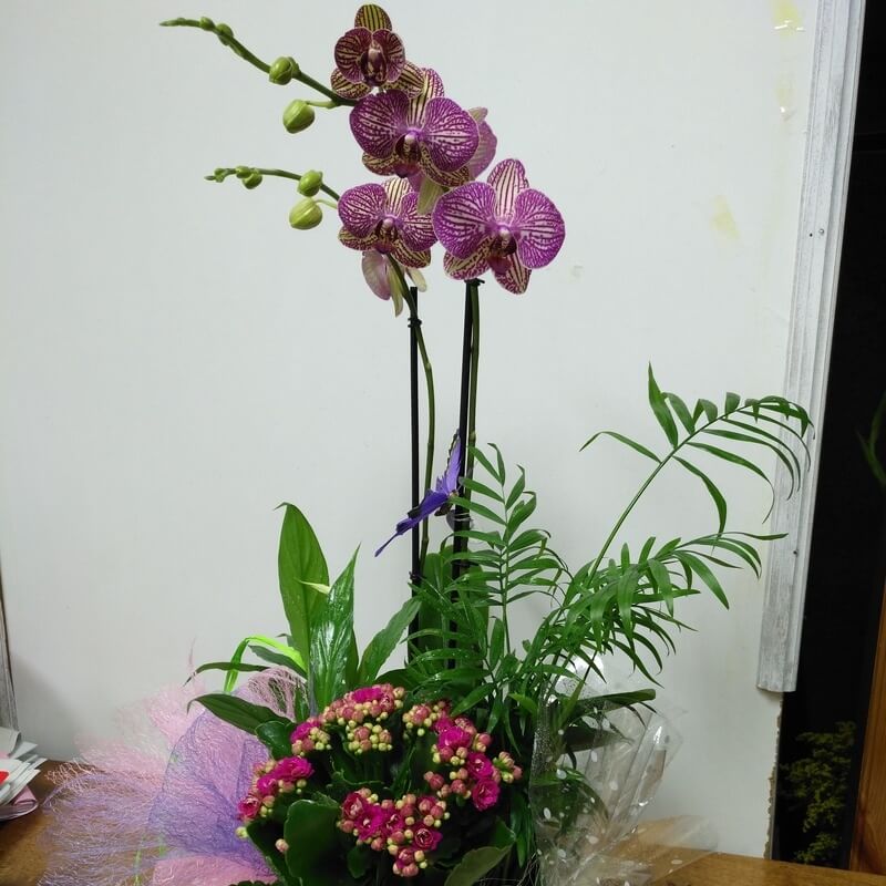 Esta Orquídea morada es una composición elegante y con mucha vida, ideal para regalar en fechas señaladas como el Día de la Madre, aniversarios, jubilaciones, cumpleaños… Reúne una orquídea, emblema de belleza y distinción, junto a la chamaedorea, una pequeña palmera de interior que aporta frescura, el spatifilium o flor de la paz y el kalanchoe, que añade toques de color.